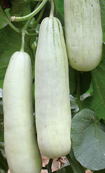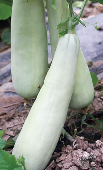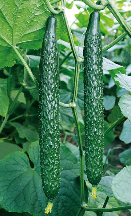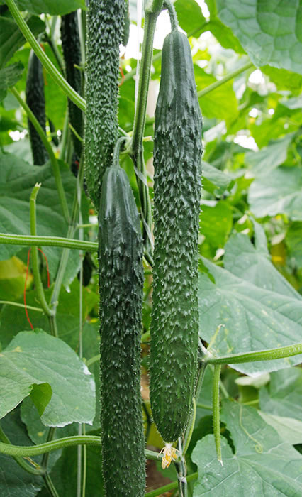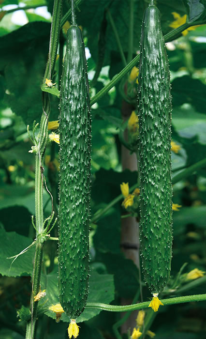 該品種為我公司最新培育的“油亮型”黃瓜新品種,植株長勢中等,節間穩定,瓜碼適中,春季種植2-3節1瓜,夏季種植3-4節一瓜,葉片墨綠,小葉片,單瓜重200克。春季種植腰瓜長近35厘米,瓜條短棒狀,粗短把密刺,刺瘤明顯,瓜條順直整齊,瓜身首尾勻稱,瓜色深綠油亮,商品性極佳。心腔細、果肉厚,果肉淡綠色,抗霜霉、靶斑等葉部病害,適合春、夏、秋露地及拱棚栽培。