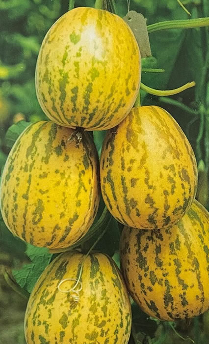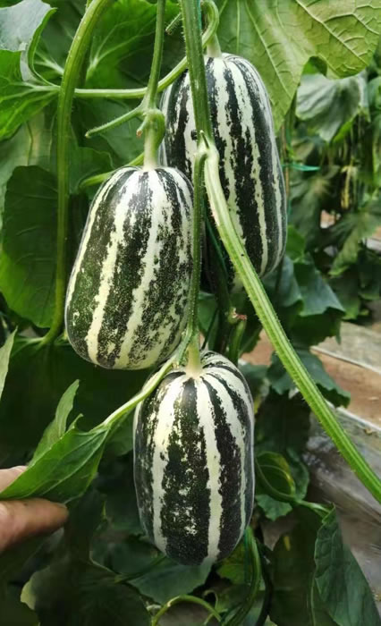 薄皮類型甜瓜,雜交一代新品種。白綠花皮,中大果型;開花后32-35天左右成熟。植株生長勢強,中抗霜霉病、白粉病和枯萎病。葉片大小中等,葉色深綠,莖蔓粗壯。坐果能力強,商品果率高。單瓜重1.0-1.6斤左右。果實粗棒狀,灰白皮綠斑條,花紋清晰,外觀新穎獨特。果長18-20厘米左右,果肉厚,種腔小。果肉黃綠色,口感脆酥,成熟后折光糖含量可達12-14%左右,風味好。
